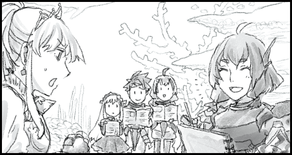 リベルタは早速、目をしばたかせる仲間たちをスケッチした。その手に持った、大事なページを開いた文献の内容も一緒に。複写してはいけないとは言われてないし、これは記念の一枚なのだ。その絵にたまたま、レムリアの重要情報が映り込んだだけなのだ。