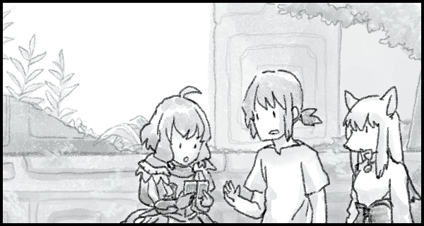 さてと、とカードを綺麗にそろえてヒロに帰しつつ、リベルタが目の前の壁を見上げる。残念ながら、休憩のひとときは終わりのようだった。ジルベルトも、皆の持ち物や体力、疲労度を確認して前に立つ。