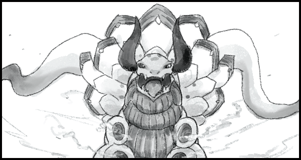 スケッチブックを置いてきたリベルタが、砲剣を抜くなりモーター音を響かせる。火山帯特有の火煙がそこかしこから吹き出る、そこは灼熱の白い闇。そして、その奥に巨大なシルエットが持ち上がった。